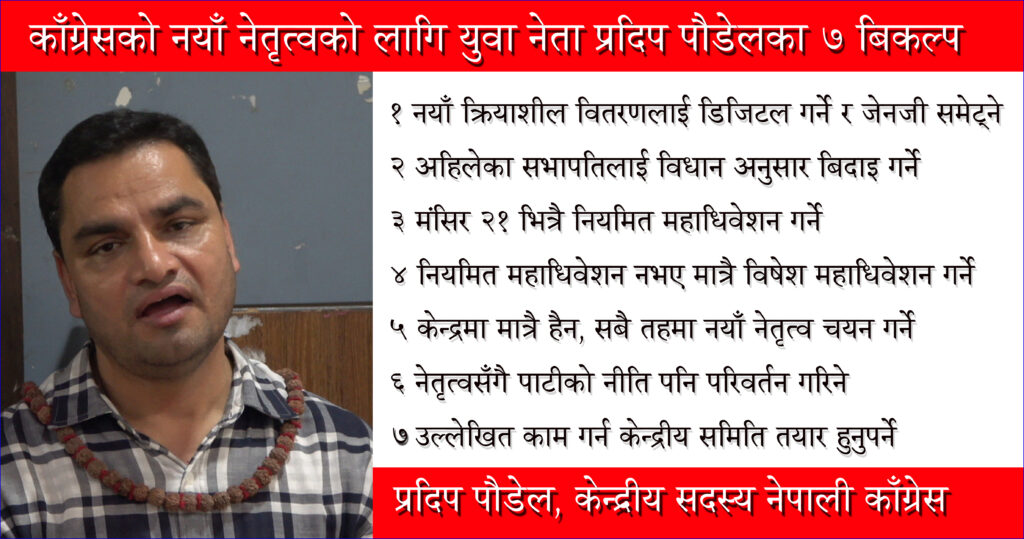 नेता पौडेलले पार्टीको नेतृत्व परिवर्तन गर्ने कुरामा पार्टीमा लामो योगदान गरेका र निरन्तर पार्टीमा देखिएकालाई नेतृत्वमा ल्याउने भन्दा पनि जेनजीले उठाएका मुद्दा र विगतदेखि रहेको राष्ट्रिय समस्या समाधान गर्न सक्ने सक्षम मान्छेले भावी पार्टीको नेतृत्व गर्ने गरी काँग्रेस अगाडि बढ्नु पर्ने अवस्था रहेको र सोही अनुसार आगामी नेतृत्व चयन हुने दाबी प्रस्तुत गरे । पार्टीको नयाँ नेतृत्व परिवर्तन सँगै काँग्रेसको नीति परिवर्तन सम्मको कुरा अहिलेको आवश्यकता भएकाले पार्टीको नियमित महाधिवेशन मार्फत मात्रै सबै कुरा सम्भव हुने भएकाले अहिले विशेष महाधिवेशन भन्दा पनि नियमित महाधिवेशन गर्न सबै लाग्नु पर्नेमा उनको जोड रहेको छ ।